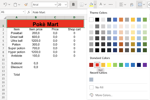 Type Poke Mart in the merged range A1:D1