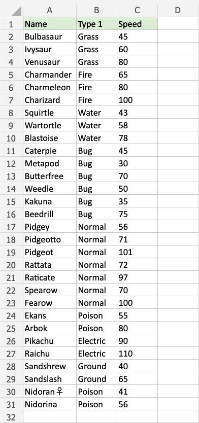 We can see that both Pidgey and Nidorina have a Speed of 56. So, they are tied for the 10th bottom value.