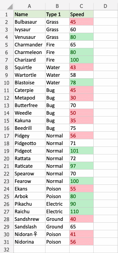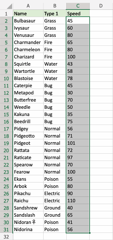1. Select the range C2:C31 for Speed values