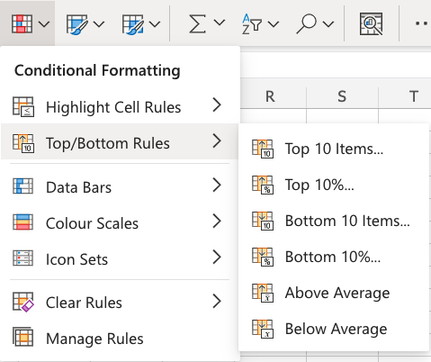 Here is the Top/Bottom Rules part of the conditional formatting menu:
