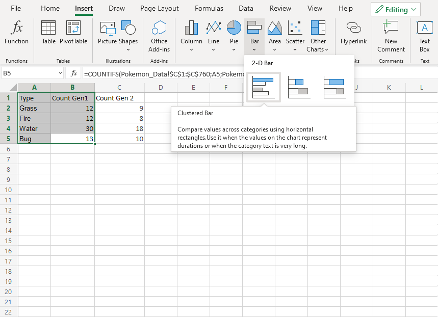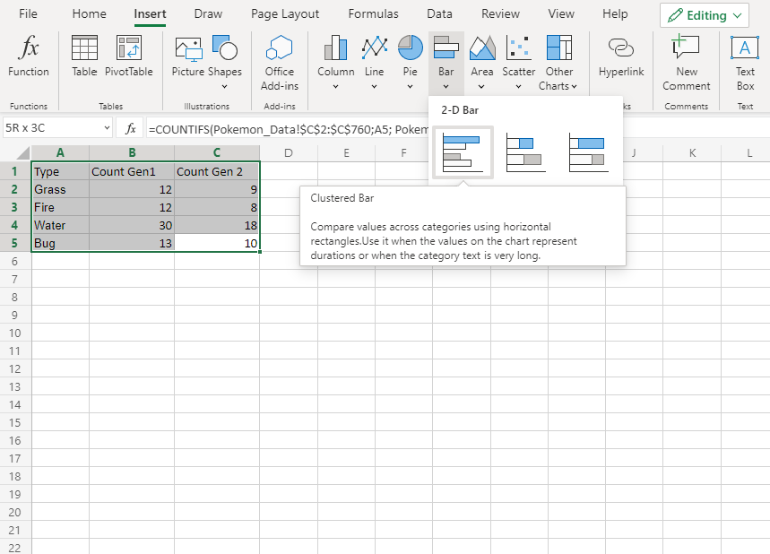 1. Click on the insert menu, then click on the bar menu () and choose Clustered Bar () from the drop-down menu