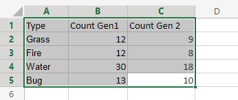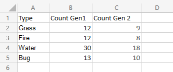 The chart gives a visual overview for the "Grass", "Fire", "Water" and "Bug" type Pokemons in generation 1 and 2.