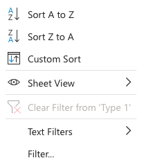 1. Click the drop down menu on C1 () and choose the Filter option. This is the Column which holds the Type 1 data.