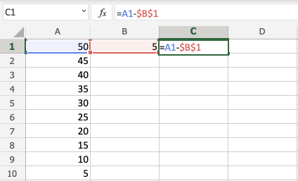 Let's have a look at an example where we subtract B(5) from the range A1:A10 using absolute reference and fill function.
