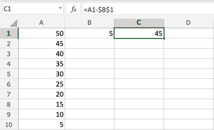 You got it! You have successfully used absolute reference to subtract B1(5) from the minuend range A1:A10.
