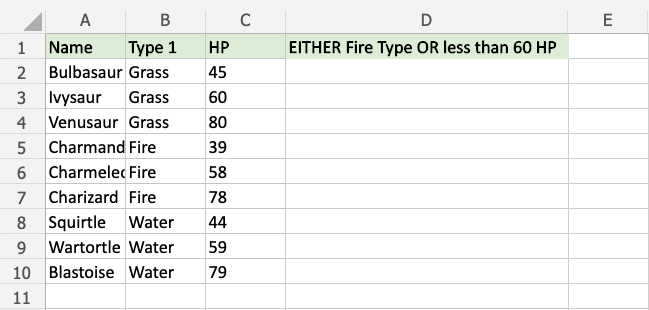 Now, each row has a check for Fire Type or HP less than 60, but not both: