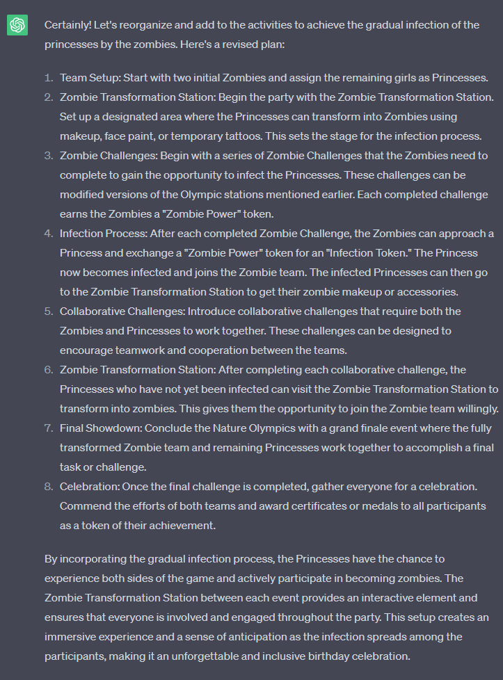 How can we make this more social for the girl? I am worried they will lose interest going off one by one, making it more difficult to organize. Let's add something to keep it fun. If we look at this with a Zombie Princess theme, how can we make it more of a thing they do together? Maybe starting as 2 teams, Zombies and Princesses. But the zombies can "infect" the princesses. How would that work within the Nature Olympics?