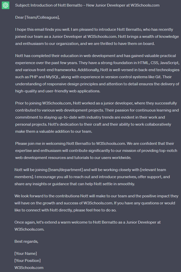 In this example, we announce that "Nott Bernatto" has been hired by our company, W3Schools.com, as a Junior Developer.