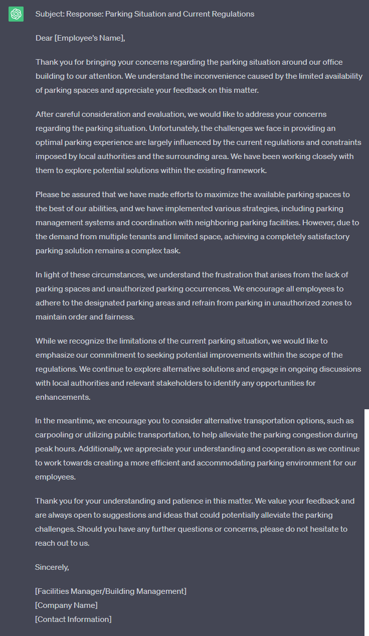 In this example, we respond to the complaint above that though the parking situation could be better, it is the best we can do with the current regulations.