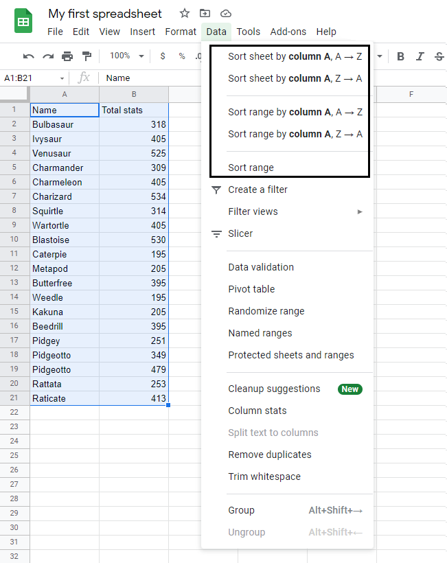 - Click on the Data menu and select Sort range by column A, A → Z