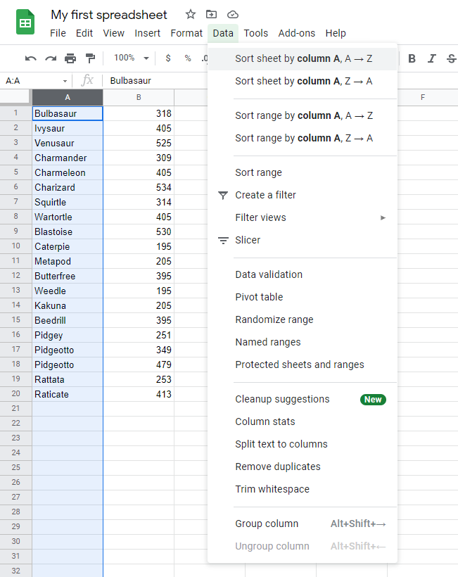 - Click on the Data menu and select Sort sheet by column A, A → Z