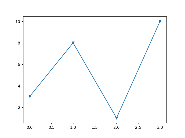 #Three lines to make our compiler able to draw: import sys import matplotlib matplotlib.use('Agg') import matplotlib.pyplot as plt import numpy as np ypoints = np.array([3, 8, 1, 10]) plt.plot(ypoints, marker = 'v') plt.show() #Two lines to make our compiler able to draw: plt.savefig(sys.stdout.buffer) sys.stdout.flush()